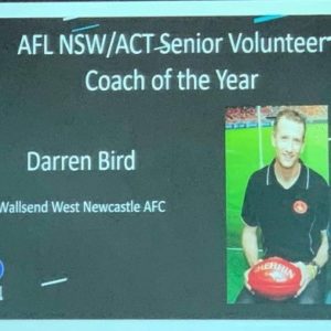 Wallsend West-Newcastle was well represented at the Regional Awards this year, making President Steve Lewer a very happy camper. WWN Swans won Region (and State) Coach of the Year, Women’s Best and Fairest Player, Women’s Coaches MVP award, and Volunteer of the Year. Plus, two of our players, Kate Booth and Amy Pitman, made the HCC AFL Team of the Year.